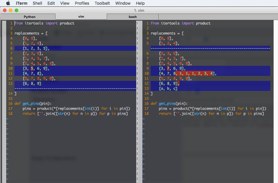 Description | Other diff tools will show character diff within the line diff. A simple example you can test at the command line (Linux, Unix, OSX, etc) is to use `vimdiff` on 2 files. Notice that the entire differing line is highlighted, meanwhile the specific differing characters are also highlighted. This is very helpful. Please consider adding this feature to VisualDiffer. Thanks. | ||||